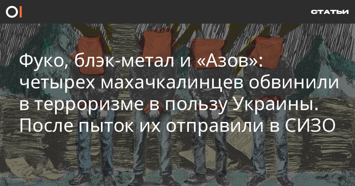 По версии обвинения, четыре дагестанца, начитавшись Ницше, стали поклоняться Гитлеру и решили поджечь войсковую часть в Махачкале — в интересах украинского полка «Азов». Следствие длилось больше двух лет, сейчас идет суд в Ростове-на-Дону. Фигуранты говорят, что их жестоко пытали и дело полностью сфабриковано.